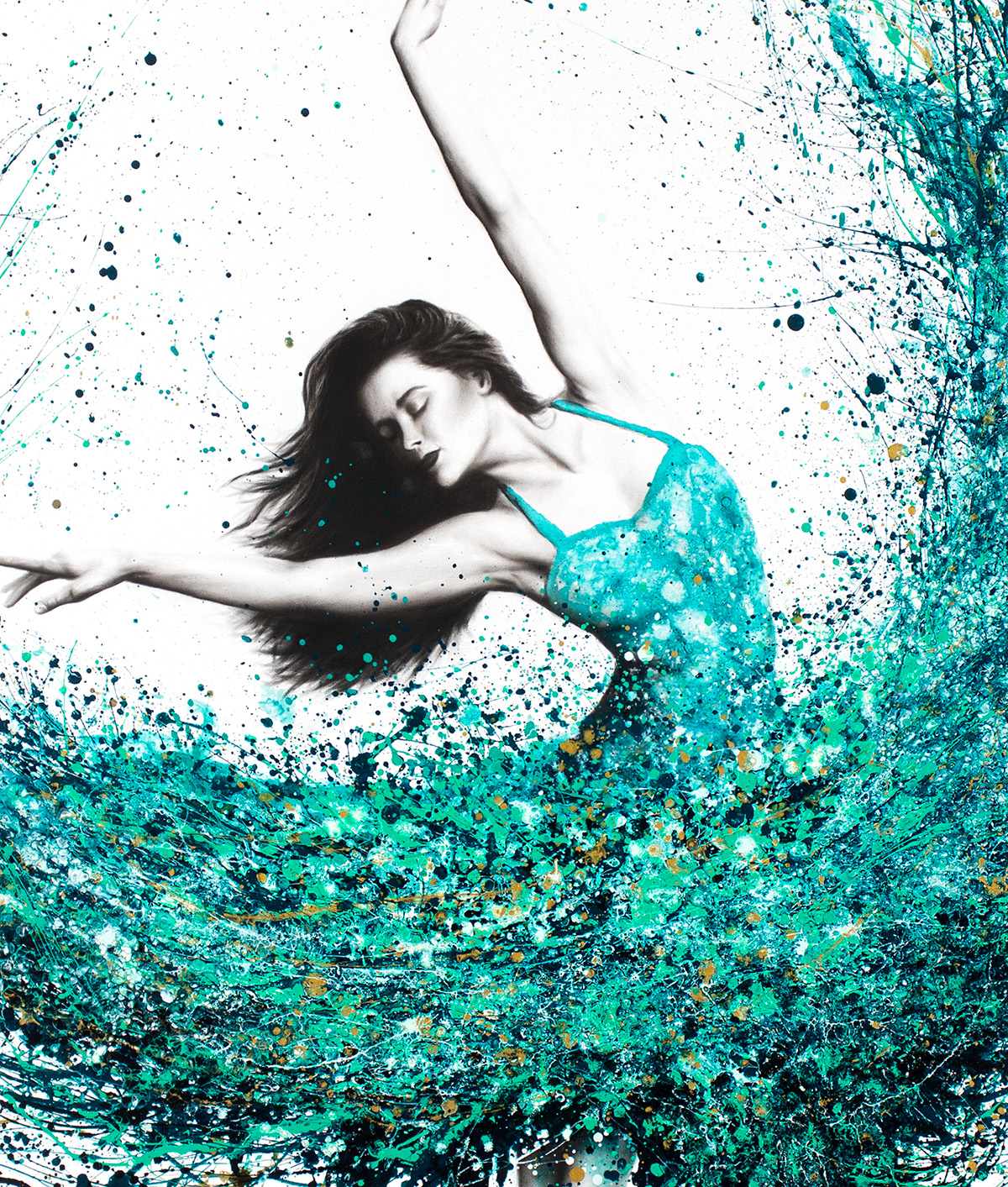 Jade Ballet (2017) captures the elegance of movement suspended in a moment of pure expression, where classical dance meets contemporary abstraction. At the centre of the composition, a poised ballerina emerges in soft charcoal realism, while a sweeping explosion of fluid colour arcs around her form — transforming motion into a living, breathing visual experience.