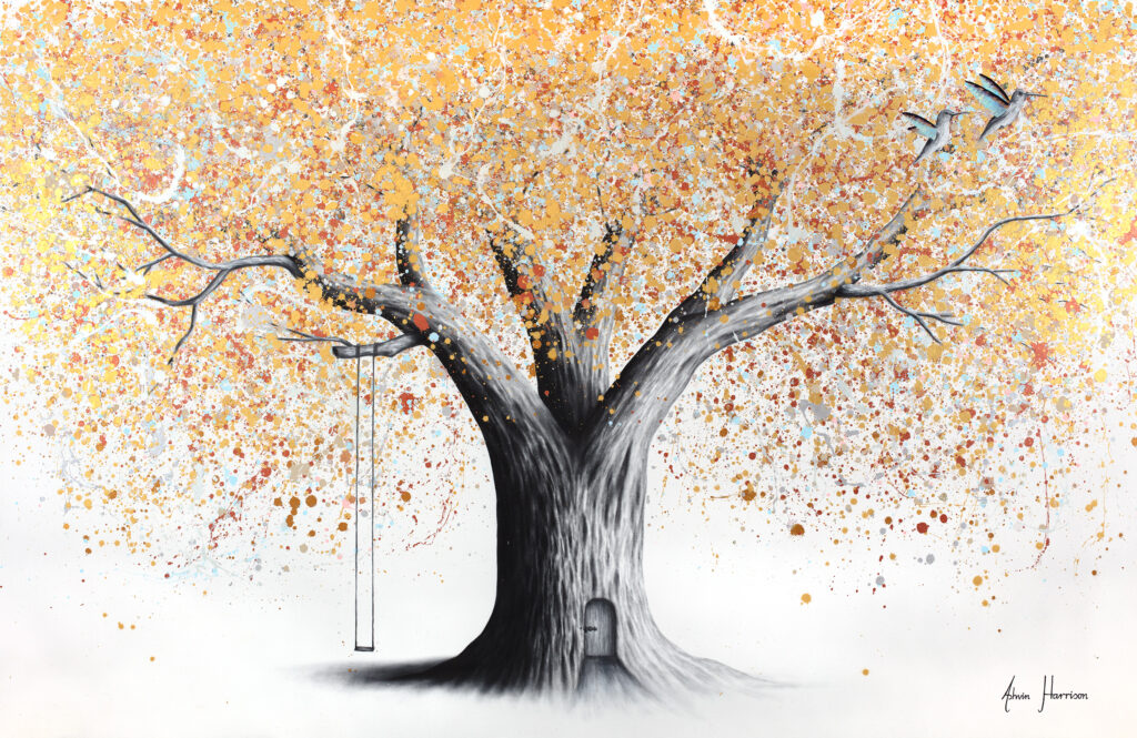This commissioned artwork is inspired by the art collector’s life experiences. ‘Love Lock Golden Tree’ is a story of love and loss brought together in this beautiful artwork. Hummingbirds represent the flight of love, the swing what could have been and the locked door represents where love can be locked away and kept safe in endless time. The tree itself is the strength life commands. This coconut charcoal, acrylic and oil painting on fine art rolled canvas is an expression of life through thought, emotion with fine art realism, expressionism and abstract styles. Charcoal provides the representational structure of the tree, using a unique and also made up technique with paint brushes. Thin and thick paint in a golden explosion of colour acrylic is splashed in energetic motion. Sparkle medium added throughout the tree throws green, purple, blue and clear sparkle effects. Oil paint in white throughout for highlights and extra realism.