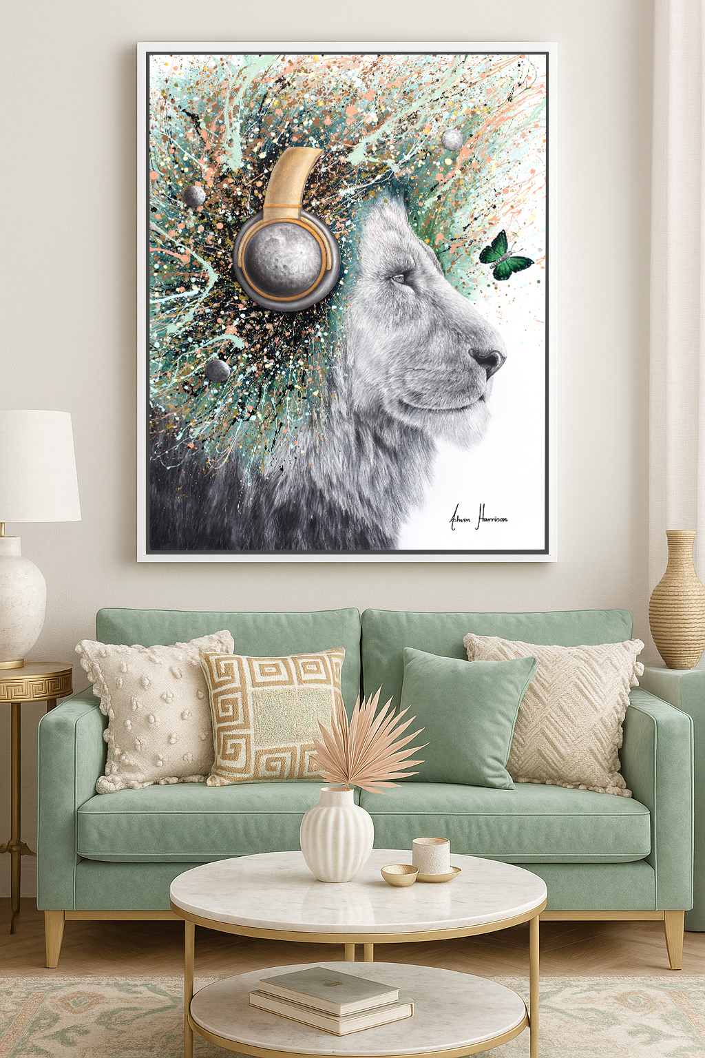 From the lion’s mane erupts a constellation of colour: splashes of mint green, peach, ivory, and soft black swirl together in a luminous explosion. The expressive movement suggests both energy and serenity — as if the universe itself is in motion around him. Small lunar spheres orbit through the composition, echoing the pull of gravity and the rhythm of celestial order. A single emerald butterfly drifts near his face, symbolising transformation, fragility, and the delicate beauty of awareness.