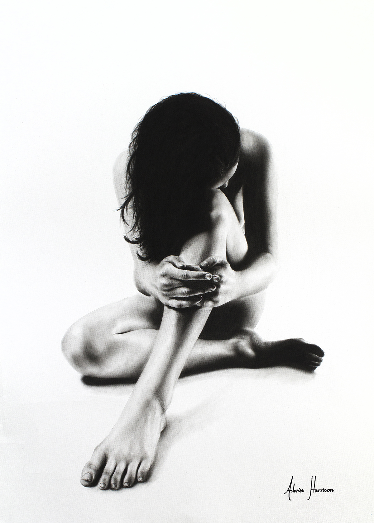A timeless expression of human emotion and form, this piece reflects the quiet intensity at the core of Ashvin Harrison’s charcoal work.