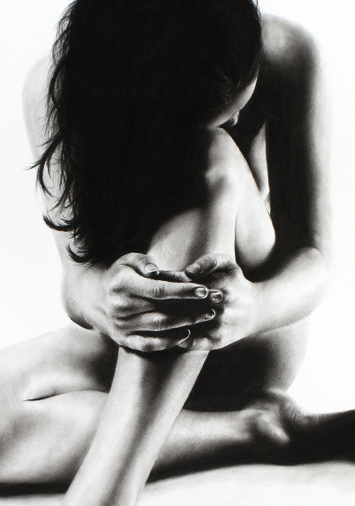 Nude Woman Charcoal Study 51 (2017) captures a deeply introspective moment, where the human form folds inward in quiet reflection. The pose conveys vulnerability and emotional depth, while maintaining a sense of strength through structure and balance.