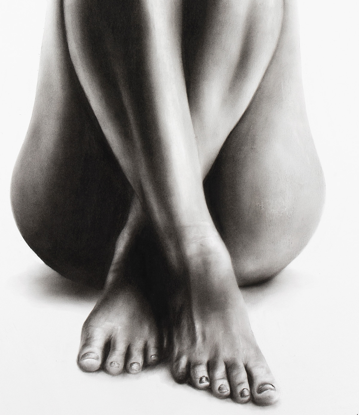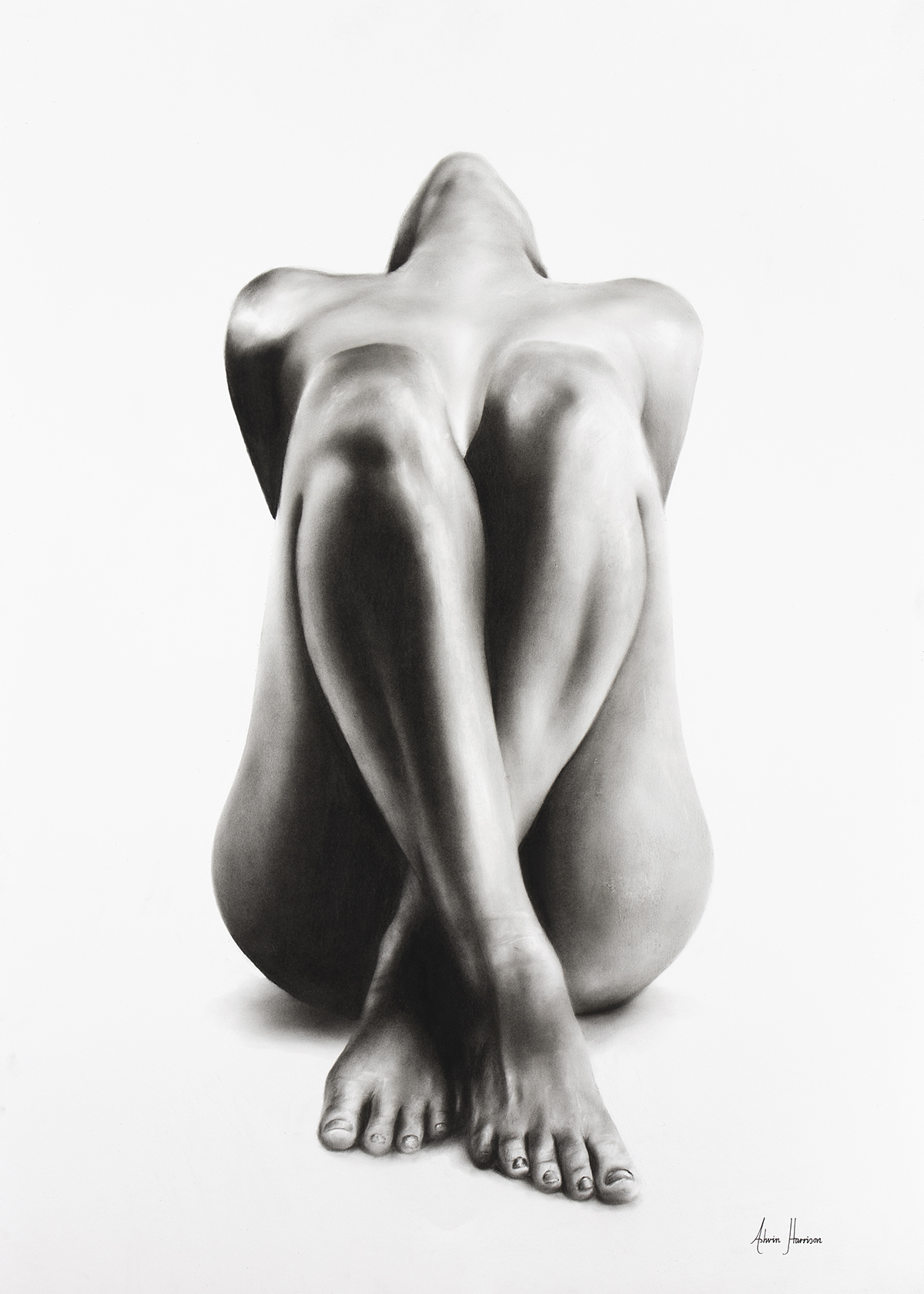 Rendered with smooth charcoal transitions, the artwork highlights the natural curvature and structure of the body. The minimal composition allows the viewer to focus purely on form, shadow, and subtle emotional presence.