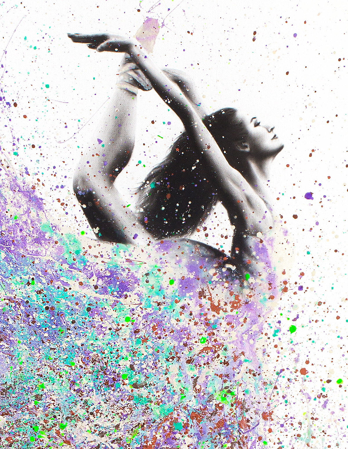 The delicate balance between the charcoal figure and the surrounding colour creates a striking visual contrast, where the dancer appears to both control and be carried by the movement around her.