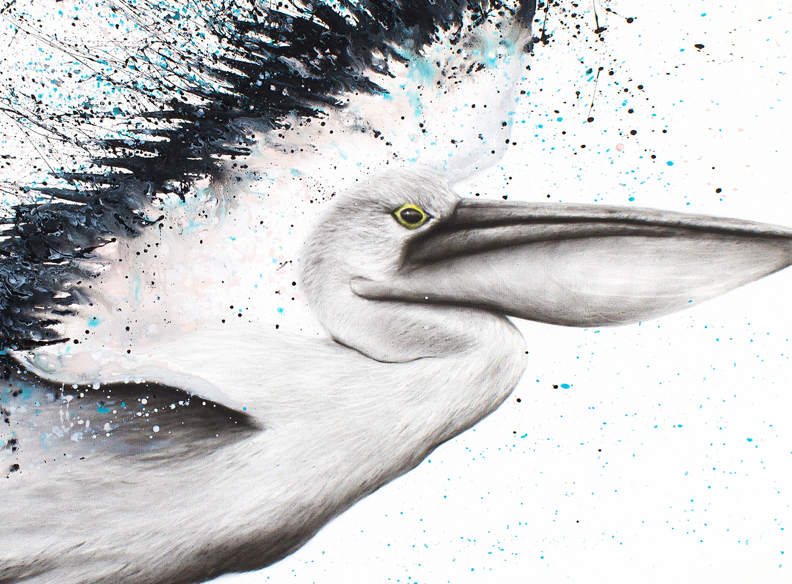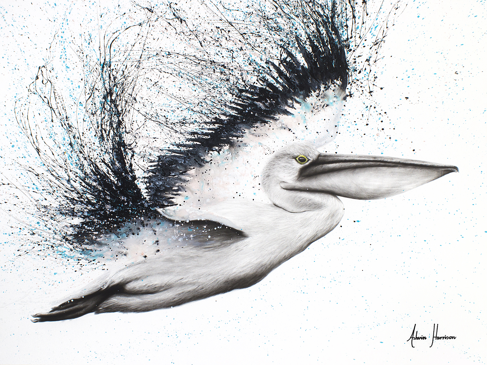 The pelican, rendered in soft charcoal detail, is brought to life through expressive splashes of black, white, and subtle blue tones that form its wings in motion. Hints of pink and marble-like textures add a unique and contemporary edge to the composition.