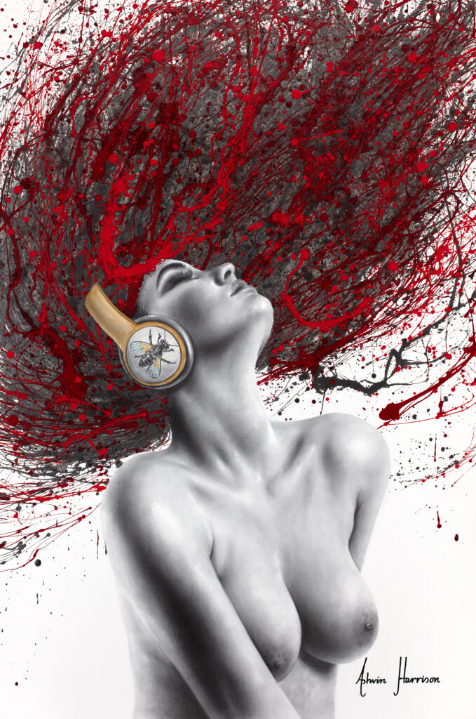 The beauty of music and feminine form have inspired the creation of this artwork ‘Rhythmic Red’. This charcoal and acrylic painting on fine art ready to hang canvas is an expression of life through thought, emotion with fine art realism, expressionism and abstract styles. Charcoal provides the representational structure for the woman posing nude with headphones on, using a unique and also made up technique with paint brushes. Thin and thick paint in onyx and red acrylic splashed in energetic motion. Oil paint throughout for highlights and extra realism.