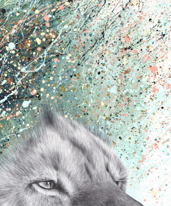 The joy of music and love of animals has inspired the creation of this artwork ‘Rhythmic Roar’. This charcoal and acrylic painting on fine art ready to hang canvas is an expression of life through thought, emotion with fine art realism, expressionism and abstract styles. Charcoal provides the representational structure for the lion with moon headphones, using a unique and also made up technique with paint brushes. Thin and thick paint in a boho colour theme of green, pink and cream acrylic splashed in energetic motion. Oil paint throughout for highlights and extra realism.