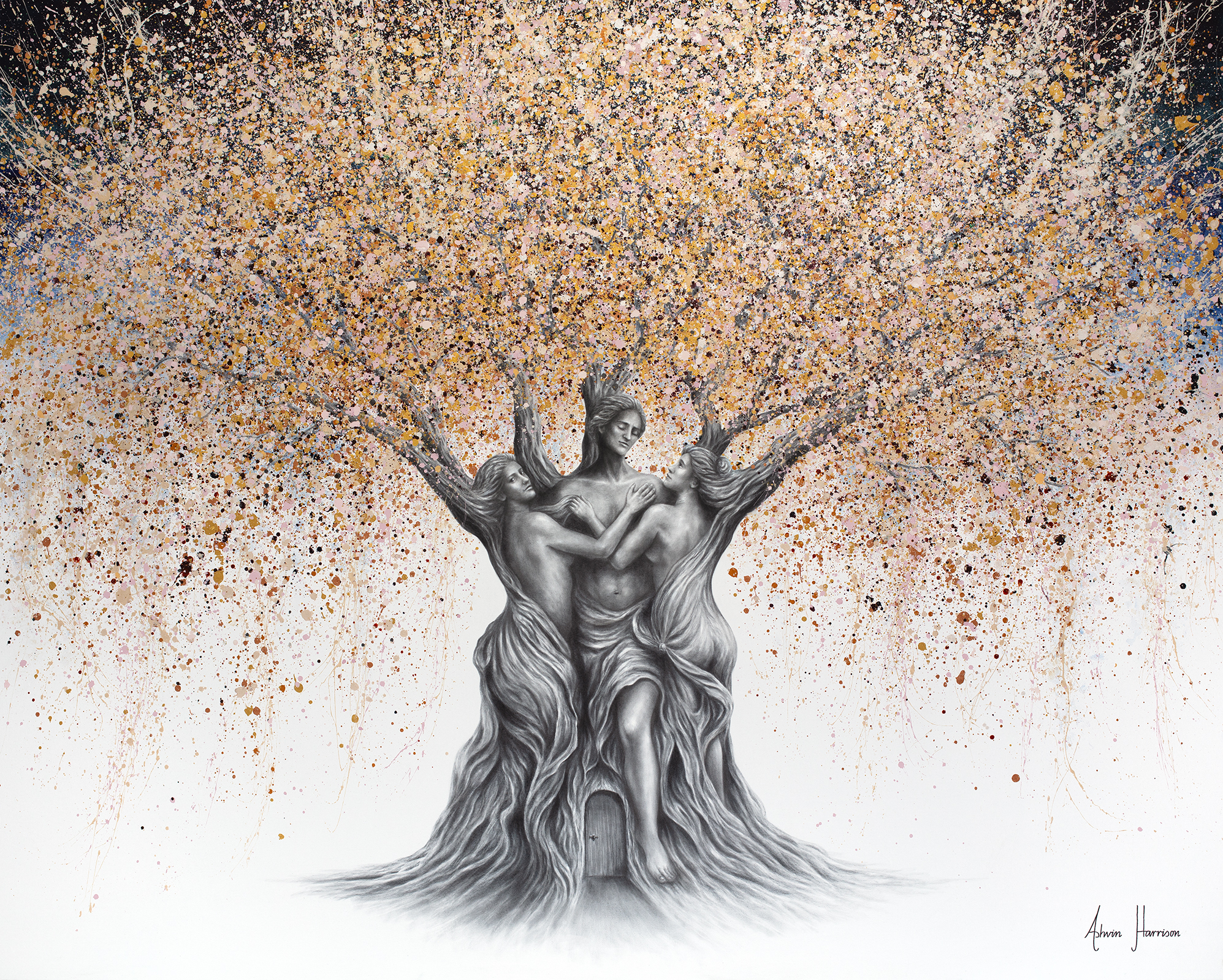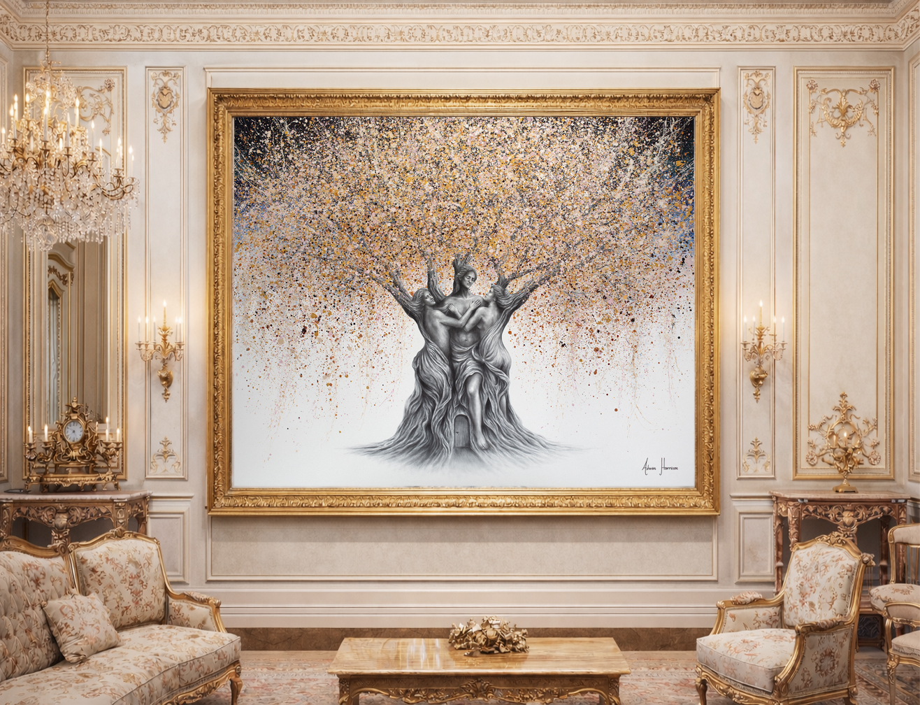 The Divine Trinity Tree is a monumental original painting by Ashvin Harrison, exploring the intertwined nature of love, identity, polarity, and existence. At this scale, the work becomes immersive — not simply something to view, but something to experience and reflect within.