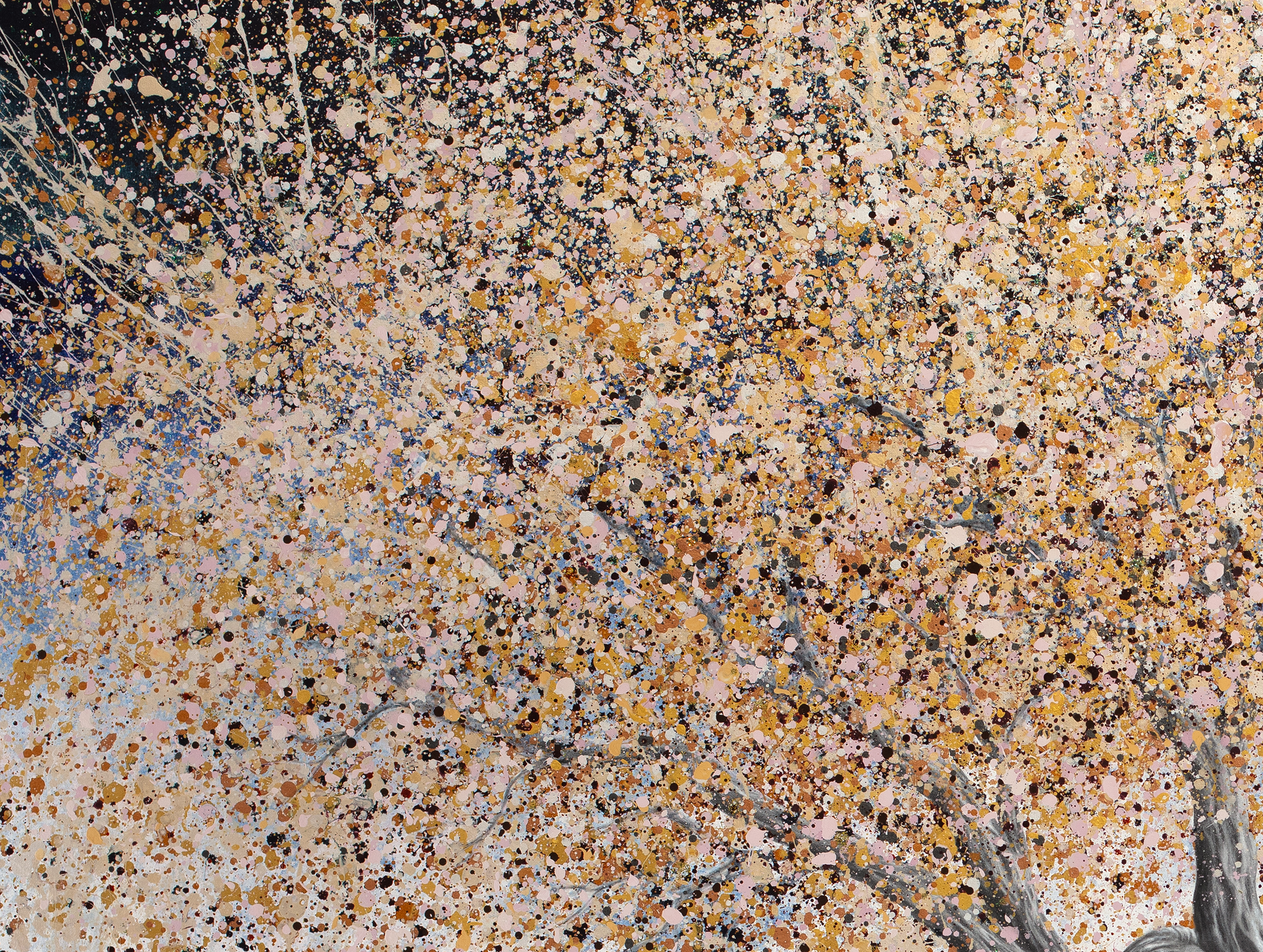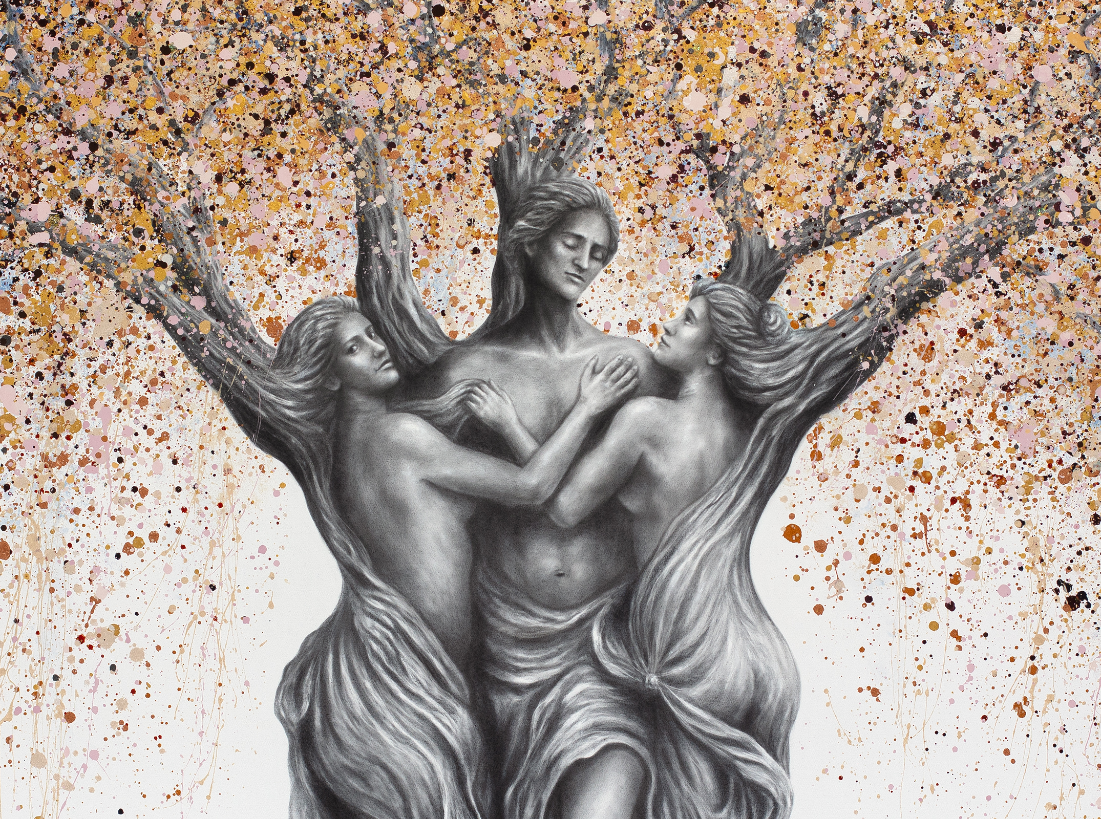 The tree itself acts as the foundation of all meaning within the work. Its trunk represents the physical body — grounded, present, and rooted in reality. From this foundation, the figures emerge, suggesting that identity is not separate from life, but grown from it. Above, the canopy expands into a vast field of gold, cream, and layered abstraction, dissolving form into movement. This represents thought, emotion, and the intangible energy of existence.