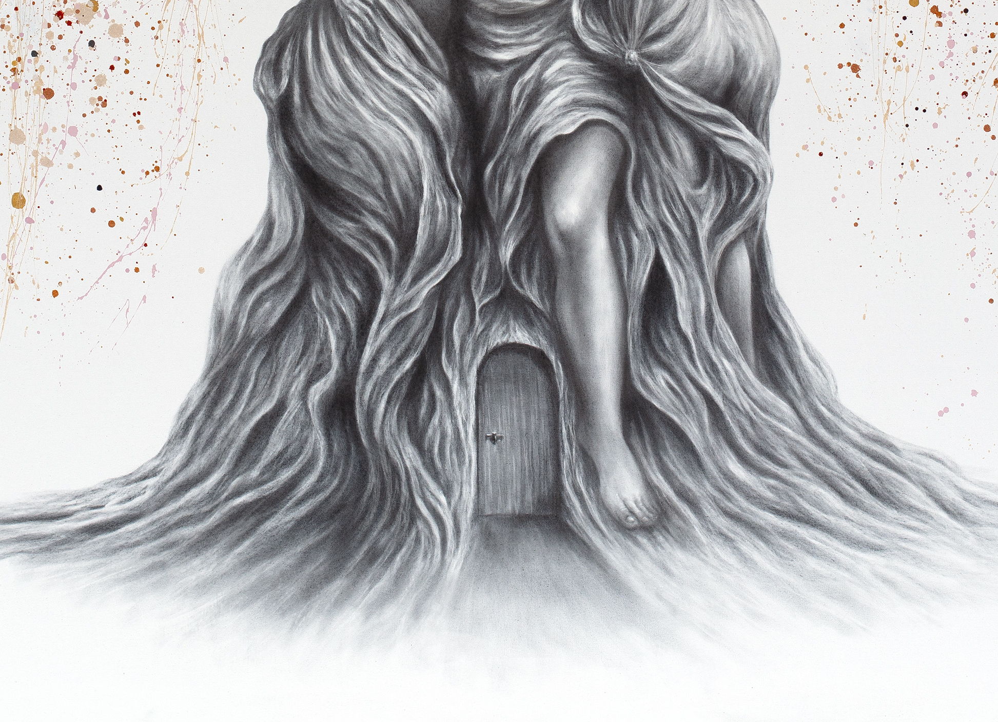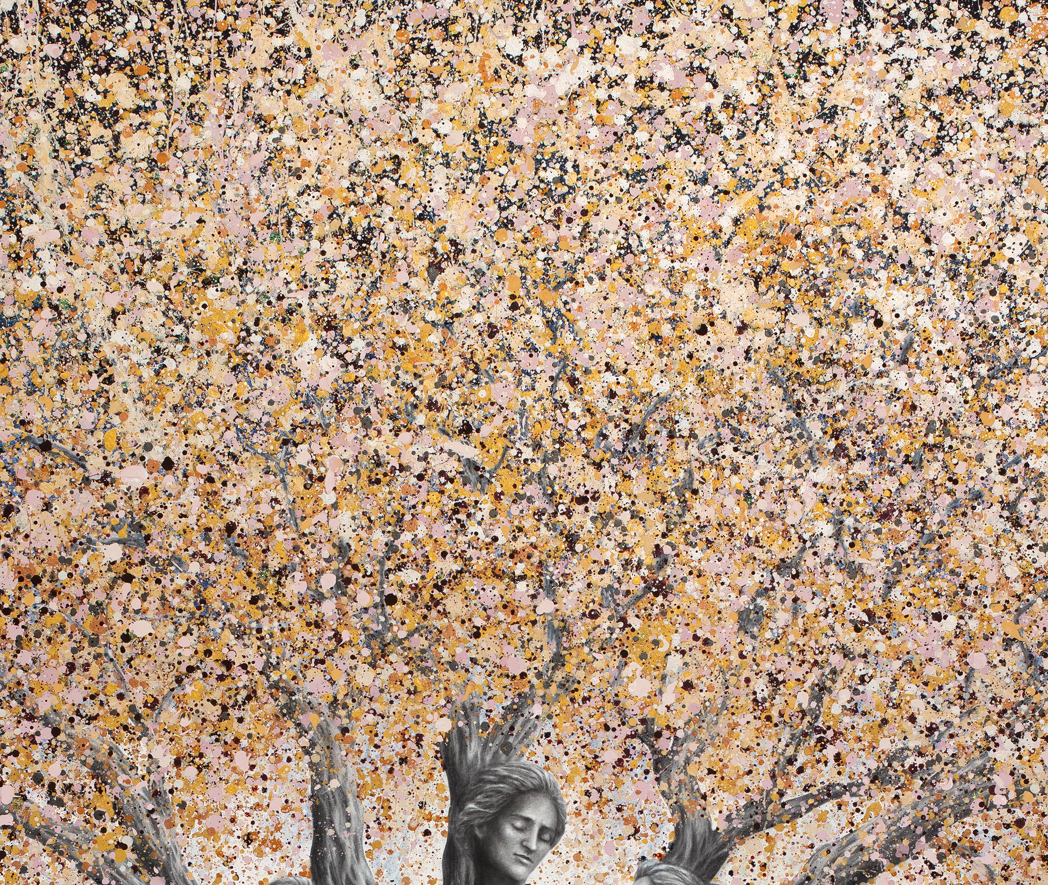 Technique: Charcoal realism combined with expressive layered abstraction and splatter dynamics