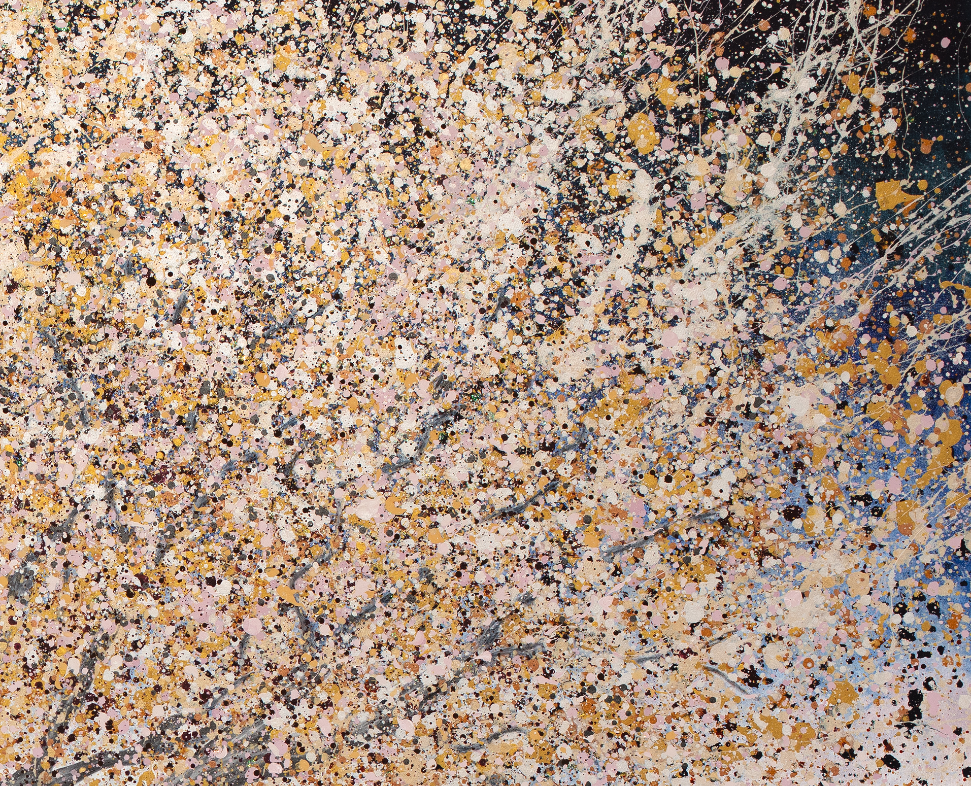Medium: Coconut charcoal powder, acrylics, oil paints, gold shimmer paint, and sparkle medium on canvas